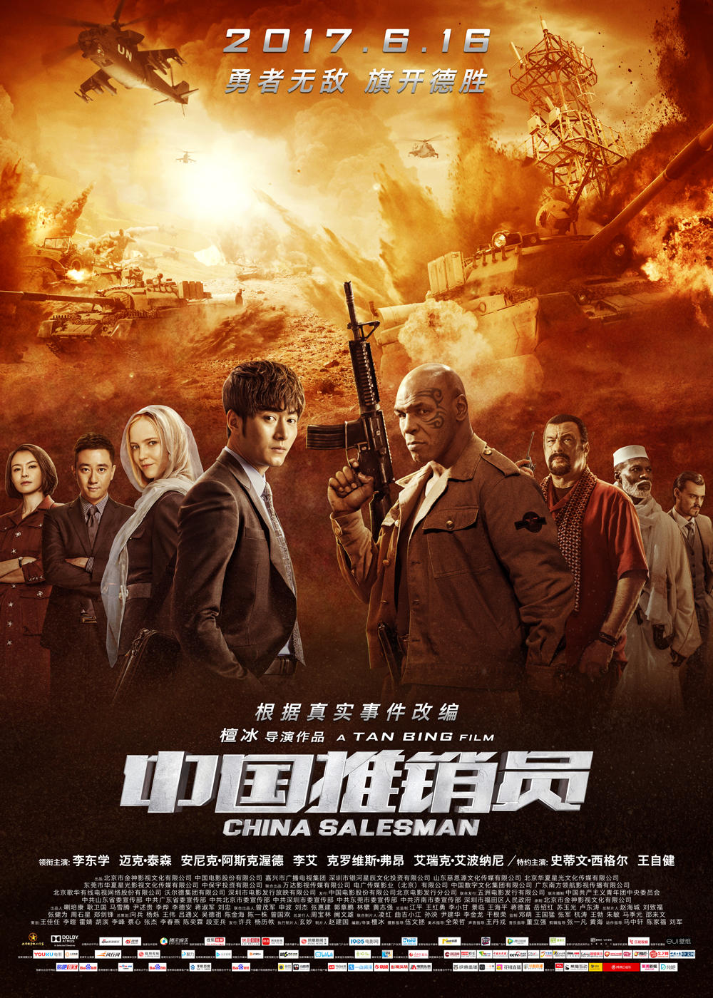Just a few weeks before Wu Jing’s Wolf Warrior II became the highest-grossing film to date in China (and the 6th highest-grossing worldwide in 2017, beating the likes of Guardians of the Galaxy Vol.2 and Wonder Woman), one film was already waving the Chinese flag in a war-torn African country, but had to settle for 191st in China’s yearly box office ranking: Tan Bing’s China Salesman. Two telecom companies, DH and MTM, are involved in a bidding war to become the main mobile network provider of an African country. But when a civil war erupts, with insurgents led by mercenary Kabbah (Mike Tyson), who is in cahoots with MTM, it’s left to Yan Jian (Ethan Li), DH’s I.T. engineer and salesman, to help the president secure a line of communication throughout the country to fight off the insurrection and restore peace. Also, alcohol is prohibited in the country, but tough-as-nails bar owner Lauder (Steven Seagal) doesn’t care.