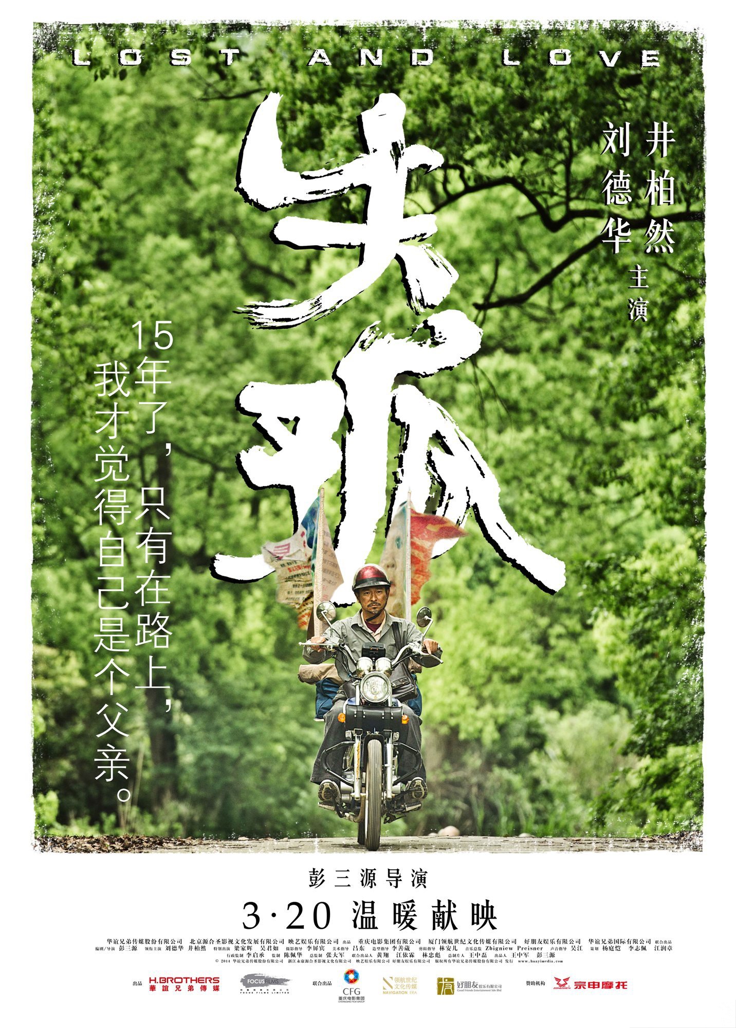 About 20,000 babies are abducted each year in China. That gut-wrenching statistic was recently the inspiration for two complementary high-profile films released within a few months of each other. Both starred A-list stars having shed all glamor to portray simple people in the pangs of abject grief, in a bid both humanistic (bringing visibility to a gaping social wound) and artistic (showing their mettle as actors). One, Peter Chan’s Dearest, starred Zhao Wei and was concerned chiefly with the agonizing emotional and social complexities resulting from child abduction, but the other, Peng Sanyuan’s debut feature Lost and Love, is a more streamlined film that strives to find beauty and hope amid all the heartbreak. Andy Lau plays Lei Zekuan, a father who has been looking for his abducted son for the past 15 years, criss-crossing a country of 1,3 billion inhabitants on his motorbike decked with flags displaying photos of his child and other abducted children, restlessly handing out leaflets, and doggedly following every single tip from online volunteers. One day, after getting into an accident on a winding mountain road, he meets Zeng Shuai (Jing Boran), a young man who repairs his motorbike, before confiding in him that he was abducted when he was four, and still doesn’t know who his biological parents are. He does not resent his adoptive parents and even loves them, but he will not be a registered citizen with an ID card and a normal life for as long as he won’t be able to prove he’s an abducted child. Thus Zekuan and Shuai decide to travel together and assist each other, forming a powerful bond along the way.